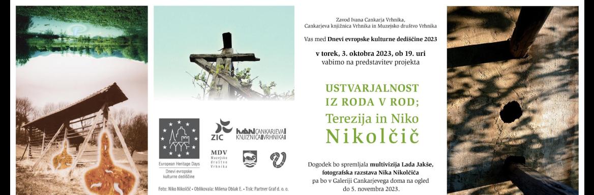 Breadcrumb Naslovnica Predstavitev projekta Ustvarjalnost i... Predstavitev projekta Ustvarjalnost iz roda v rod: Terezija in Niko Nikolčič, Vrhnika, 3. 10. 2023 kdaj03.10.2023 ob 00:00 sl:Dogodki:Predstavitev projekta Ustvarjalnost iz roda v rod: Terezija in Niko Nikolčič, Vrhnika, 3. 10. 2023 [edit]
