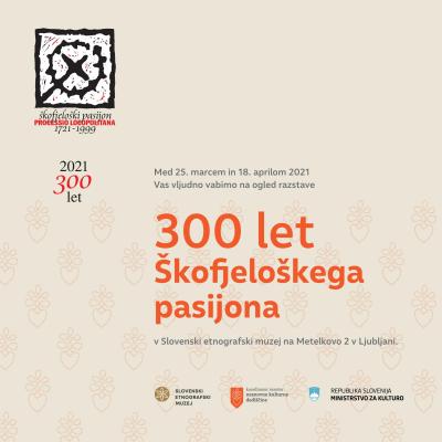 Slovenski etnografski muzej kot Koordinator varstva nesnovne kulturne dediščine letošnjo 300-letnico Škofjeloškega pasijona obeležuje z manjšo priložnostno razstavo. Razstava bo v razstavni hiši Slovenskega etnografskega muzeja na ogled med 25. marcem in 18. aprilom 2021. Škofjeloški pasijon je spokorniška procesija, ki prikazuje Kristusovo trpljenje in motive iz Stare in Nove ...