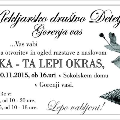 Klekljarsko društvo Deteljica Gorenja vas Vas vabi na otvoritev in ogled razstave z naslovom Čipka - Ta lepi okras, ki bo v petek, 20. 11. 2015, ob 16. uri v Sokolskem domu v Gorenji vasi. Razstava bo na ogled še v soboto, 21. 11. 2015 med 10.00 in 20.00 uro ...