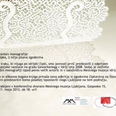 21.5.2013 ob 18. uri bo v konferenčni dvorani Mestnega muzeja Ljubljana predstavitev monografije »Idrijska čipka, z nitjo pisana zgodovina«. Na predstavitvi bo orisana vloga Ljubljane na tem področju.