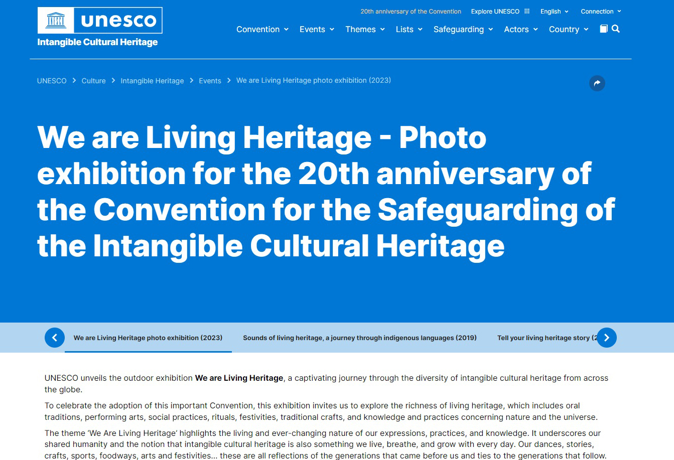 Na sedežu Unesca v Parizu je med novembrom 2023 in aprilom 2024 na ogled razstava z naslovom We are Living Heritage (Mi smo nesnovna dediščina), ki je bila posvečena 20. obletnici Unescove Konvencije o varovanju nesnovne kulturne dediščine, ki smo jo obeleževali v lanskem letu. Na razstavi je predstavljen izbor elementov nesnovne kulturne dediščine, ki odražajo bogastvo nesnovne kulturne dediščine s celega sveta. Z dvema fotografijama je na razstavi zastopana tudi nesnovna kulturna dediščina iz Slovenije, in sicer čebelarstvo in tradicije reje lipicancev.
