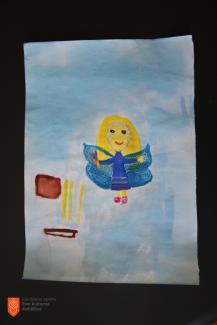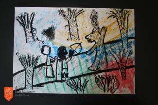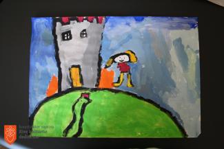 Žana Pintarič, Osnovna šola Belokranjskega odreda Semič, 3. razred, 8 let – Kočevarska pravljica o kači velikanki, ognju in stolpu (tempera).