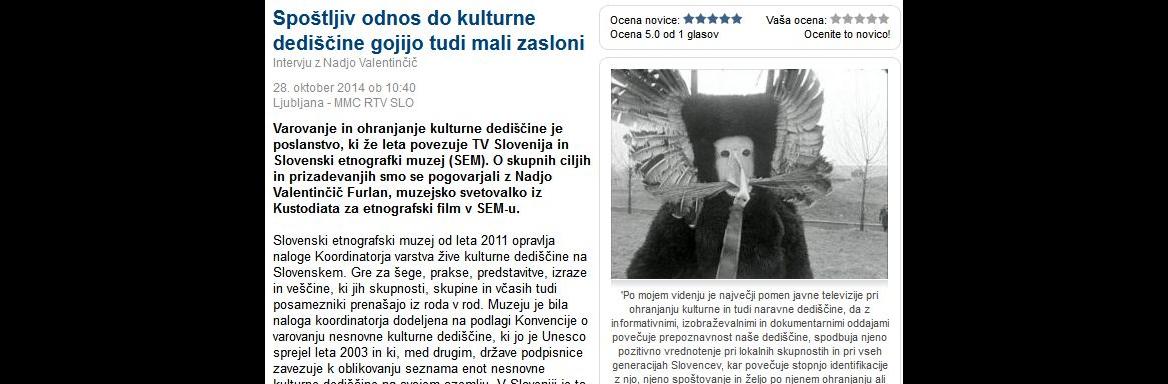 Na spletni strani Multimedijskega centra RTV SLO je o varovanju in ohranjanju kulturne dediščine, ki že leta povezuje TV Slovenija in Slovenski etnografski muzej, spregovorila svetovalka iz Kustodiata za etnografski film Slovenskega etnografskega muzeja Nadja Valentinčič Furlan. Celoten intervju si lahko preberete v članku Spoštljiv odnos do kulturne dediščine gojijo tudi mali zasloni.