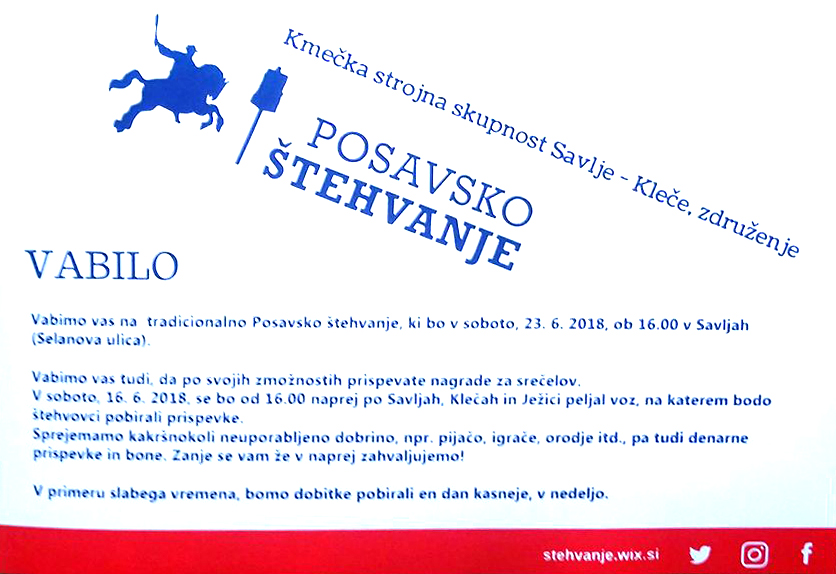 V soboto 23. junija 2018 je v Savljah potekalo 64. Posavsko štehvanje, ki ga je organizirala Kmečka strojna skupnost Savlje Kleče – Združenje. Potek tokratnega dogajanja je dokumentirala tudi predstavnica Koordinatorja Nena Židov.