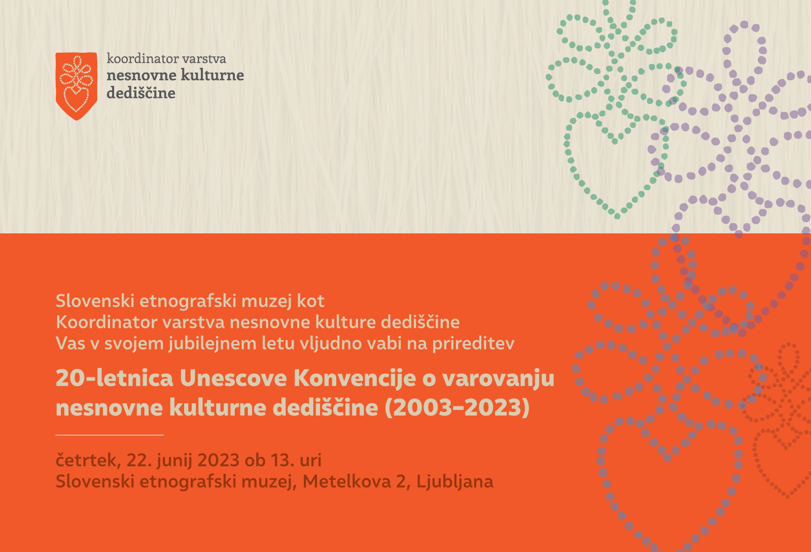 Lepo vabljeni na obeležitev 20-letnice Unescove Konvencije o varovanju nesnovne kulturne dediščine, ki bo potekala v sklopu praznovanja SEM 100 let: Praznujmo skupaj!, v četrtek 22. junija 2023 v Slovenskem etnografskem muzeju.