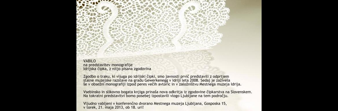 21.5.2013 ob 18. uri bo v konferenčni dvorani Mestnega muzeja Ljubljana predstavitev monografije »Idrijska čipka, z nitjo pisana zgodovina«. Na predstavitvi bo orisana vloga Ljubljane na tem področju.