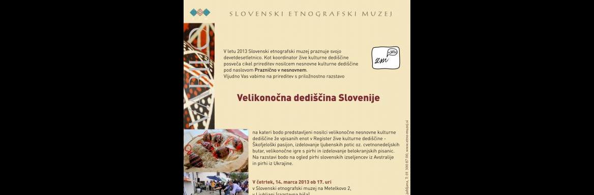 Slovenski etnografski muzej v letu 2013 obeležuje devetdesetletnico z raznovrstnimi prireditvami in razstavami. Pod naslovom Praznično v nesnovnem posveča SEM že drugo prireditev nosilcem nesnovne kulturne dediščine, tokrat velikonočnim. Prireditev bo potekala v četrtek, 14. marca, ob 17. uri v razstavni hiši Slovenskega etnografskega muzeja.