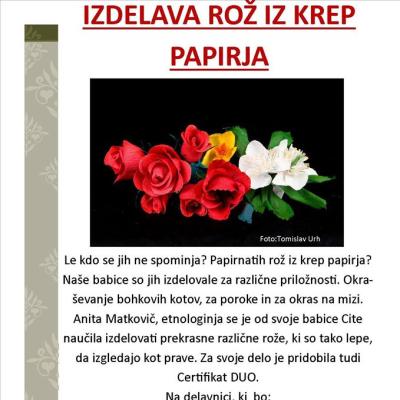 V sredo, 17. februarja 2016 bo ob 17:00 v Belokranjskem izročilu, Ulica Staneta Rozmana 6 v Črnomlju, delavnica izdelave rož iz krep papirja, ki ga bo vodila etnologinja Anita Matkovič. Kotizacija 10 € ( material in prigrizek ter napitki med delavnico). Obvezne prijave na telefon 040175711 (Bernarda) oziroma na naslov ...