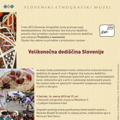 Četrtek, 14. marec 2013, 17:00, odprtje razstave Velikonočna dediščina Slovenije, razstavna hiša SEM Slovenski etnografski muzej v letu 2013 obeležuje devetdesetletnico z raznovrstnimi prireditvami in razstavami. Pod naslovom Praznično v nesnovnem posveča SEM že drugo prireditev nosilcem nesnovne kulturne dediščine, tokrat velikonočnim. Prireditev bo potekala v četrtek, 14. marca, ob ...
