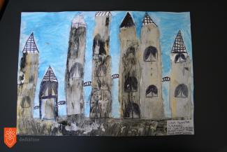 Eva Družinec, Osnovna šola Cvetka Golarja, 4. razred, 10 let - Zgodba o nastanku grba mesta Škofja Loka (drgnjenka- frotaž + tuš).