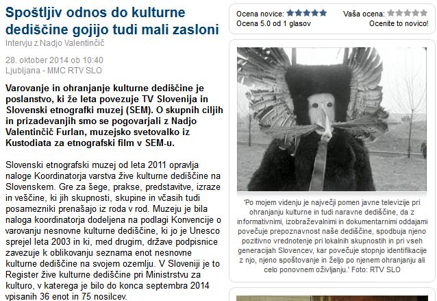 Na spletni strani Multimedijskega centra RTV SLO je o varovanju in ohranjanju kulturne dediščine, ki že leta povezuje TV Slovenija in Slovenski etnografski muzej, spregovorila svetovalka iz Kustodiata za etnografski film Slovenskega etnografskega muzeja Nadja Valentinčič Furlan. Celoten intervju si lahko preberete v članku Spoštljiv odnos do kulturne dediščine gojijo tudi mali zasloni.