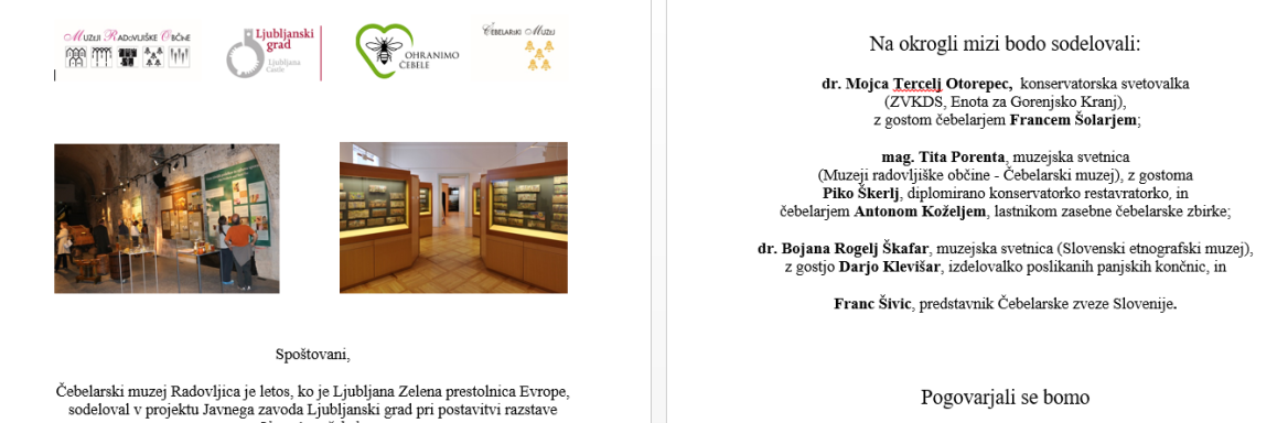 Okrogla miza je kot zadnji dogodek v spremljajočem programu potekala v sklopu razstave Ohranimo čebele, ki je bila do 25. septembra 2016 na ogled na Ljubljanskem gradu.