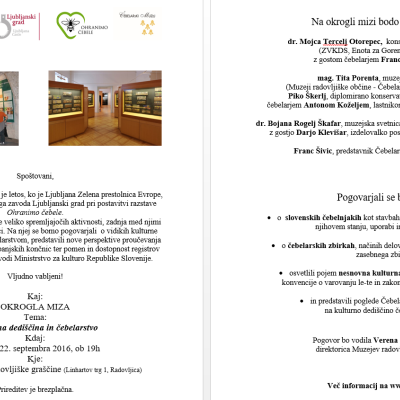 Predstavnica Koordinatorja varstva nesnovne kulturne dediščine dr. Bojana Rogelj Škafar se je udeležila okrogle mize z naslovom Kulturna dediščina in čebelarstvo, ki je potekala v četrtek 22. septembra 2016 v plesni dvorani Radovljiške graščine. Okrogla miza je kot zadnji dogodek v spremljajočem programu potekala v sklopu razstave Ohranimo čebele, ki ...