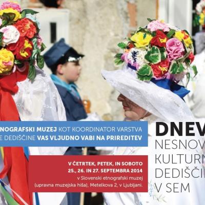 Med 25. in 27. septembrom 2014 so v Slovenskem etnografskem muzeju potekali prvi Dnevi nesnovne kulturne dediščine v SEM, ki so se pričeli v četrtek, 25. septembra 2014, ob 11.00 s predstavitvijo treh publikacij na temo nesnovne kulturne dediščine. Dr. Nena Židov (SEM) je predstavila publikacijo Promocija nesnovne kulturne dediščine ...